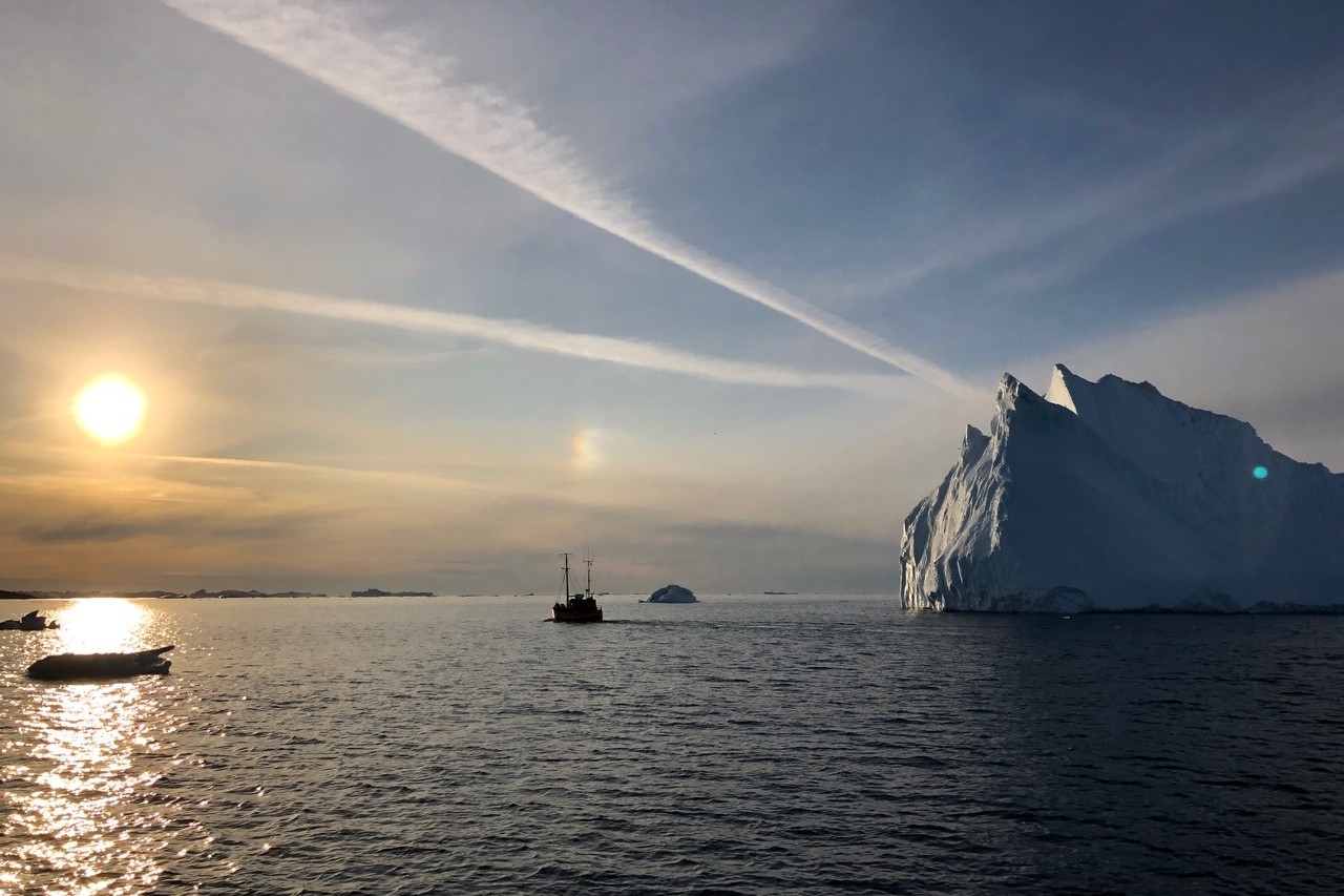 Por la tarde, navegación entre icebergs gigantes bajo la luz del sol de medianoche, acercándonos a la desembocadura del Fiordo de Hielo de Ilulissat, uno de los glaciares más activos del planeta.