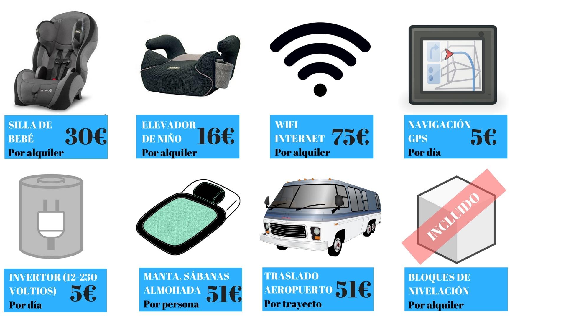 El precio no incluye: Precio base de 195 EUR, seguros opcionales, gasolina/diésel (el vehículo se entrega con depósito lleno y hay que devolverlo de la misma forma), gas (las botellas de gas se entregan llenas y el cliente tiene que devolverlas llenas), extras como mantas y sábanas (consulta la lista de extras posibles a contratar). Recogidas / devoluciones durante los sábados y los domingos (suplemento de 95 EUR). Traslados desde/al aeropuerto. - Recogidas y oficina: La recogida es entre las 10:00-17:00 horas. La devolución es entre las 09:00 -14:00 hs.