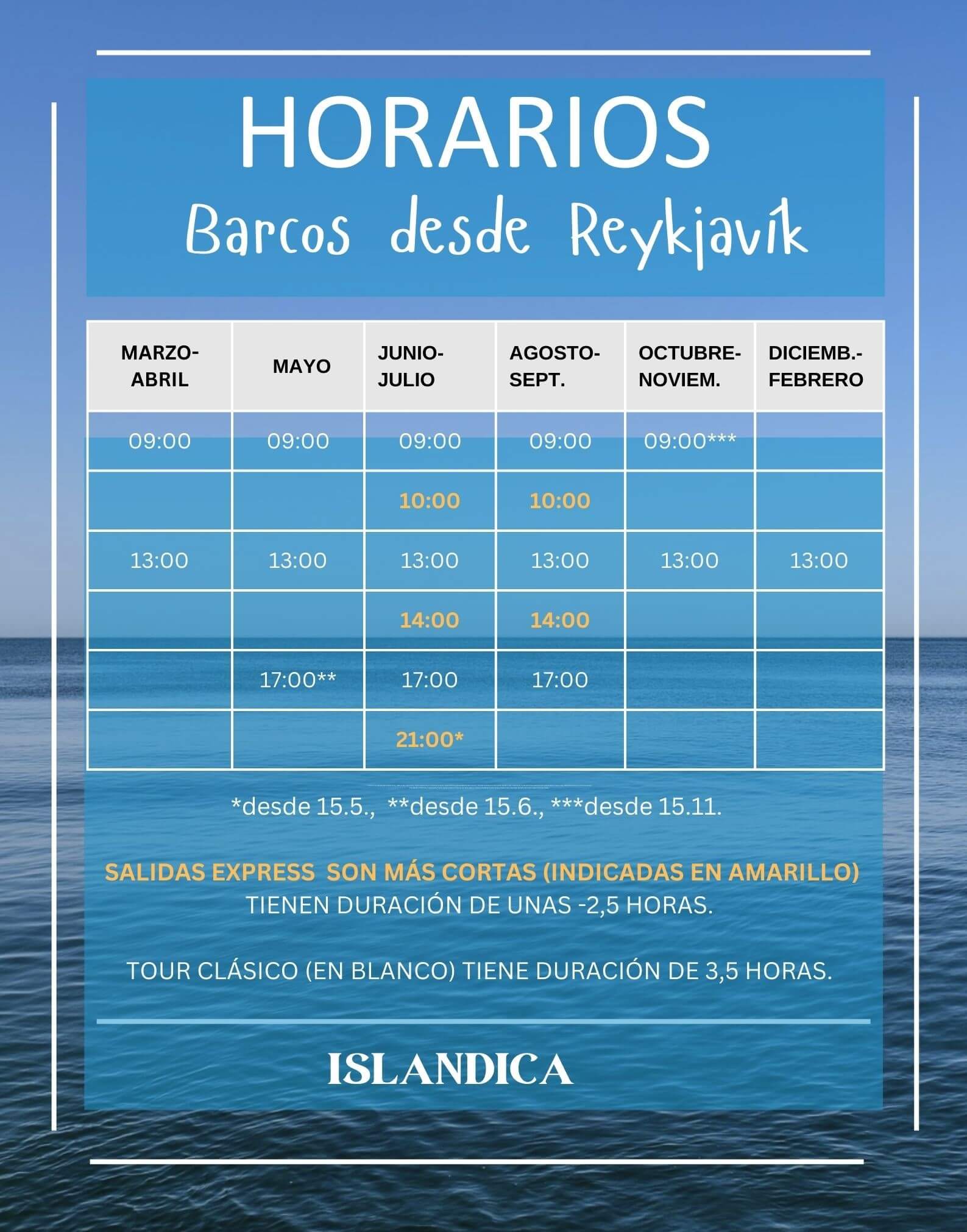 Horario de avistamiento de ballenas: Las salidas clásicas de 3-3,5 horas y las salidas express de 2-2,5 horas están en la tabla.