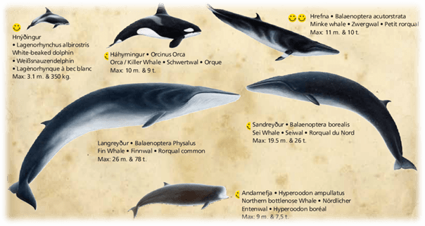 Las condiciones climáticas y las estaciones influyen en los tipos de ballenas que se pueden ver: generalmente, en mayo se avistan más ballenas azules, en junio prevalecen las ballenas jorobadas y entre julio y agosto las ballenas minke suelen ser las protagonistas. En Islandia se han identificado hasta 23 especies de ballenas, además de varios tipos de delfines.