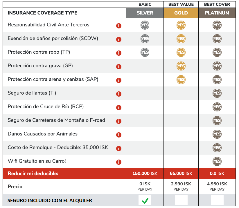 El PAQUETE DE SEGUROS SILVER (seguros SCDW, TP y TPL) está incluido en la reserva tu coche de alquiler. LOS PAQUETES DE SEGUROS GOLD Y PLATINUM los puedes contratar al recoger el coche de alquiler en nuestra oficina en Islandia. Mira qué incluye cada paquete de seguros en la tabla: