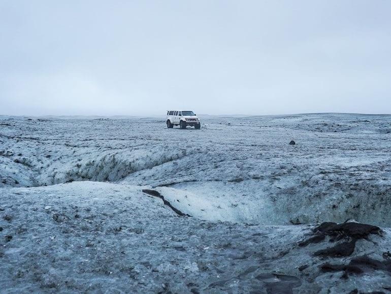 La excursión a la cueva de hielo empieza en la laguna Jökulsárlón, donde te recogerá nuestro guía. Desde ahí vais a dirigiros en un super jeep hasta la lengua glaciar del Vatnajökull, donde recibirás el equipamiento necesario para poder entrar en la cueva. Luego sigue la caminata de unos 20 o 30 minutos hasta la entrada de la cueva.