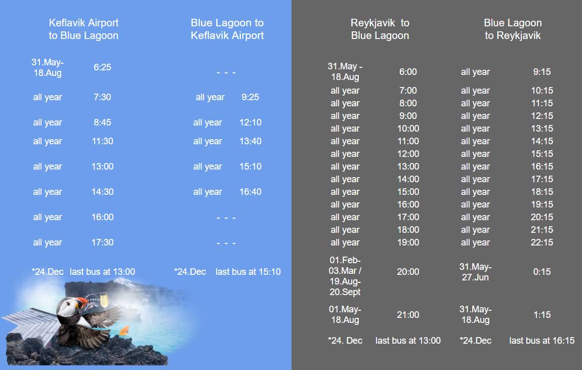 TIMETABLE AND MAP FOR SHUTTLE BUS TRANSFER FROM THE BLUE LAGOON TO REYKJAVÍK .