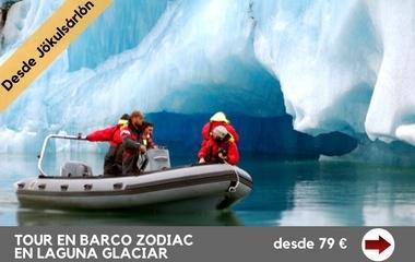Para navegar en una laguna glaciar, ofrecemos dos lugares diferentes: la archiconocida laguna Jökulsárlón, en el glaciar Vatnajökull (uno de los lugares que no te puedes perder en tu visita a Islandia); y la laguna Fjallsárlón, en el mismo glaciar y no menos espectacular, con la ventaja de que habrá menos turistas al no ser tan popular.