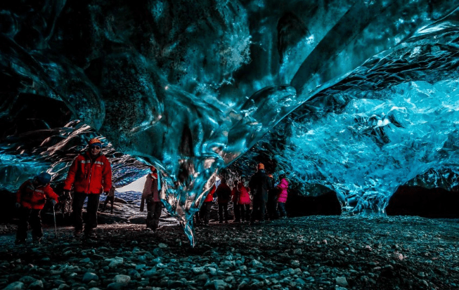 Por otra parte, las cuevas glaciares son cuevas que se forman en el interior del hielo del glaciar Vatnajökull. Las cuevas solo se pueden visitar durante el invierno y se forman por el agua que corre a través o por debajo del glaciar. Esta agua, que muchas veces proviene de la superficie del glaciar por el deshielo, entra en el hielo a través de un molino glaciar y sale por el hocico del glaciar hacia abajo. La transferencia de calor desde el agua causa la suficiente fusión para crear una cavidad en el interior del hielo llena de aire. Después, el movimiento del aire causa que las cuevas se vayan ampliando.