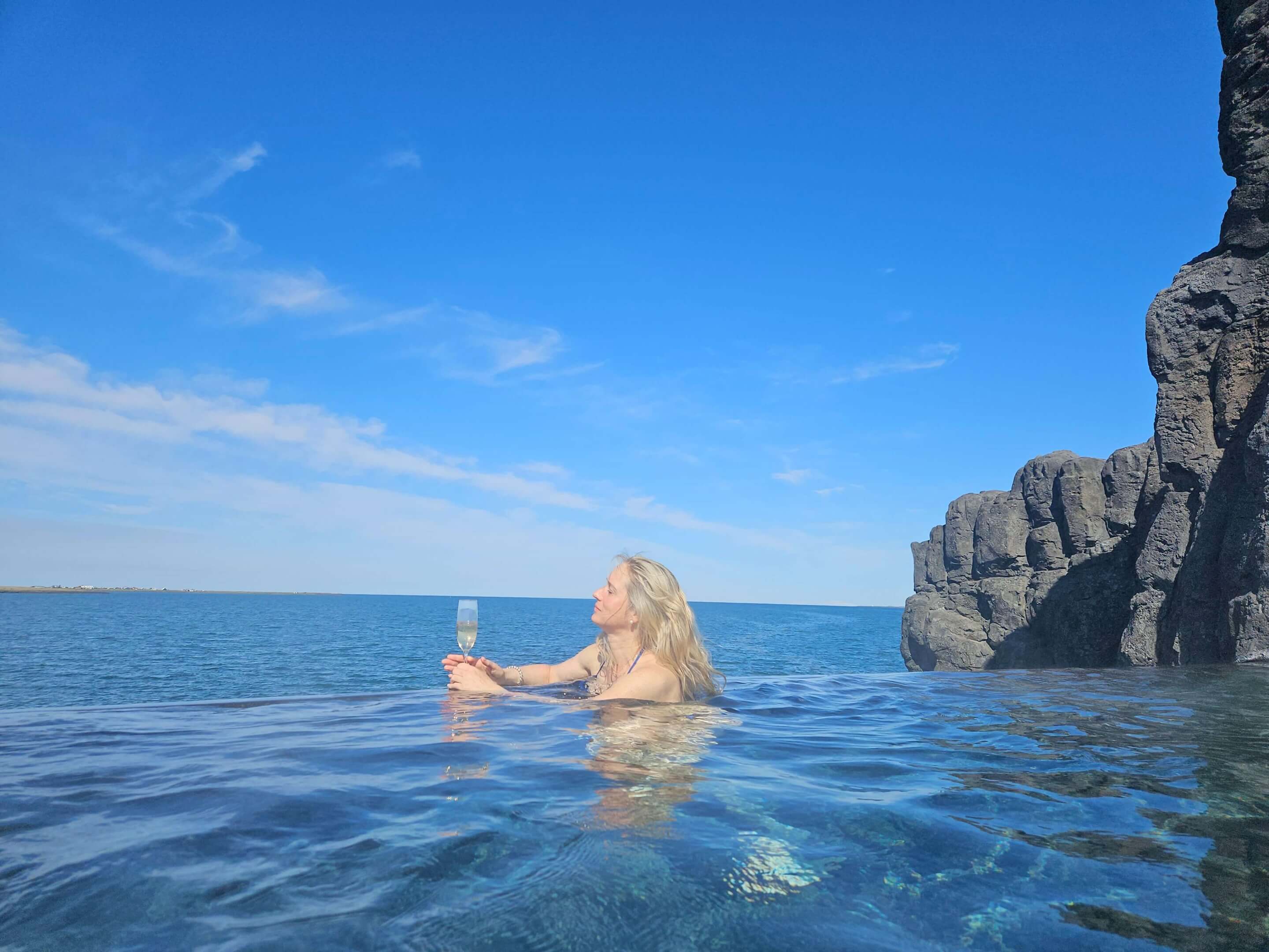 La fascinante laguna termal Sky Lagoon sobre los acantilados en el océano Atlántico es una maravilla de wellness. Los amantes de los baños termales no deberían perderse esta experienca ya que el balenario está ubicado muy cerca de la capital de Islandia (a solo  unos 10 minutos en coche desde el centro de Reykjavík) y a 46 kilómetros desde el aeropuerto internacional de Keflavík.