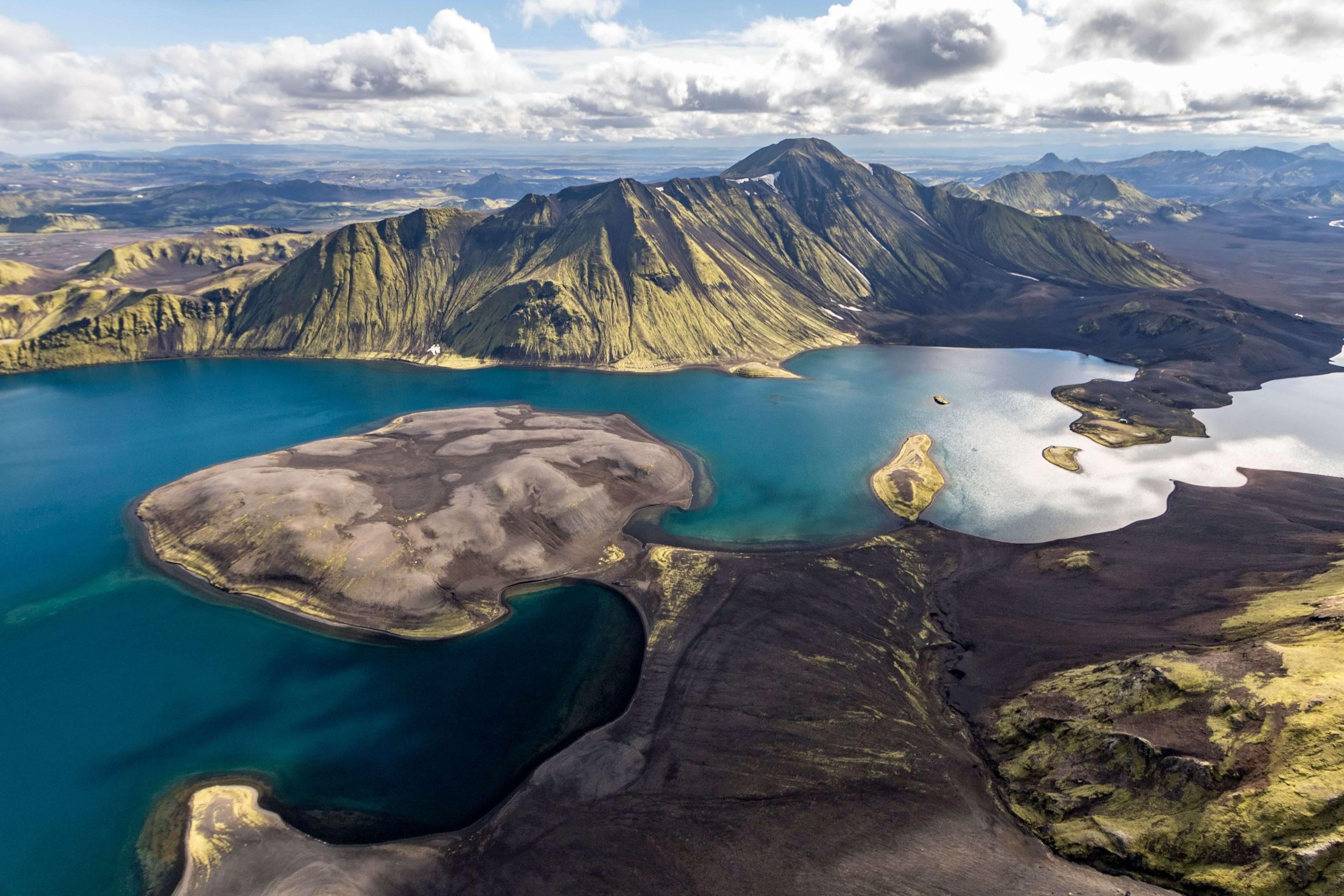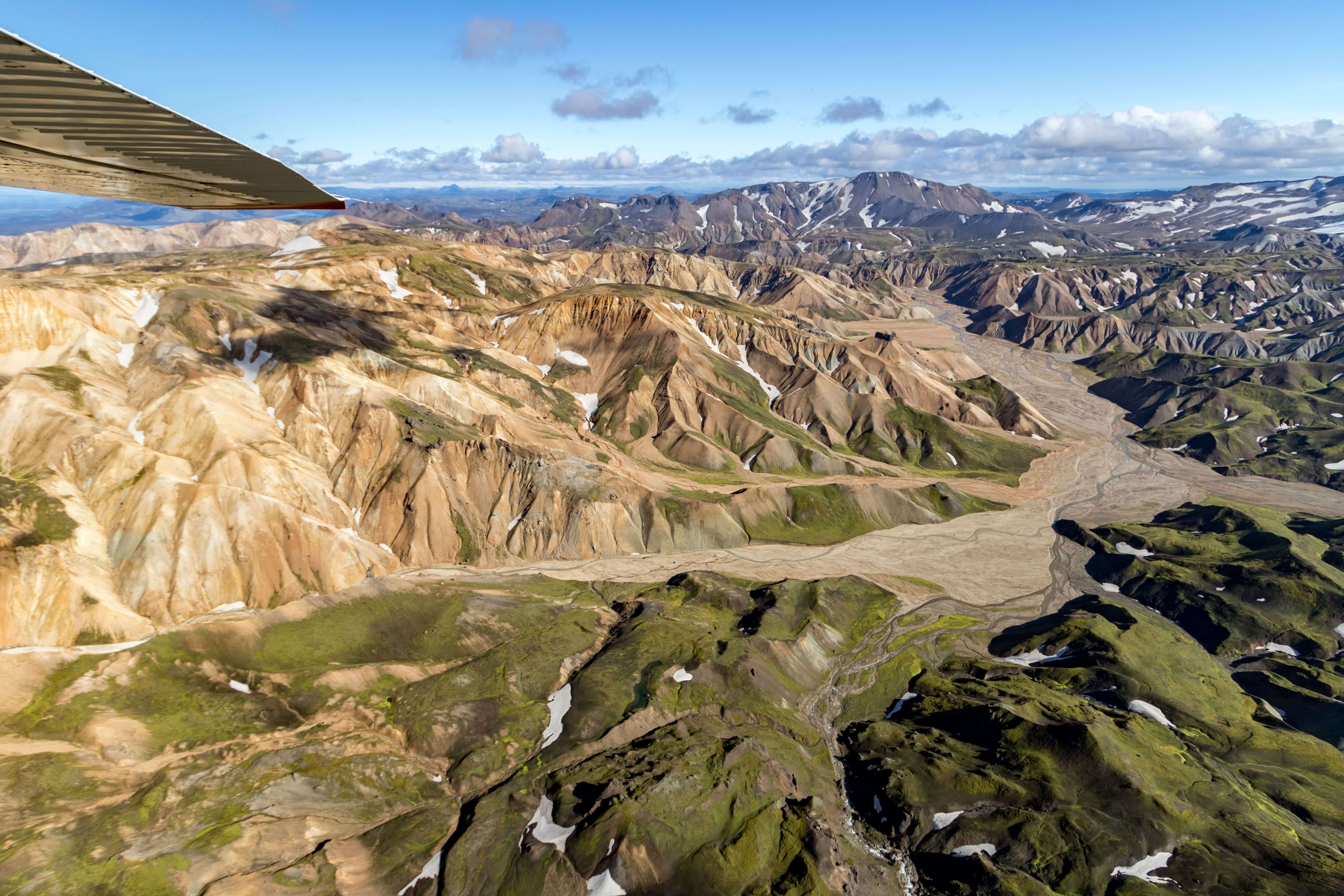 Antes del vuelo y tras registrarte en la Terminal de Skaftafell, conocerás a nuestro piloto. Además de darte la bienvenida, te enseñará la ruta que vas a hacer y, por supuesto, las normas de seguridad. Volaremos en dirección oeste hacia los cráteres Lakagígar, Landmannalaugar y mucho más. En primer lugar, sobrevolaremos la lengua glaciar Skeiðarárjökull, parte del glaciar más grande de Europa, el Vatnajökull. Después pasaremos por la famosa cadena de cráteres Lakagígar, unos 135 cráteres de unos 25 km de longitud formados en los años 1783-1784, durante una de las mayores erupciones volcánicas registradas en la historia (un tercio de la nación islandesa falleció en dicha erupción). Desde Lakagígar pondremos rumbo a Landmannalaugar, el famoso interior montañoso de Islandia. Landmannalaugar es conocido por sus manantiales geotérmicos naturales y por sus montañas de riolita, las cuales le dan un color único, con diferentes tonalidades de rosa, verde, azul y amarillo dorado, que hacen que sea un paisaje increíble para tomar fotos aéreas.