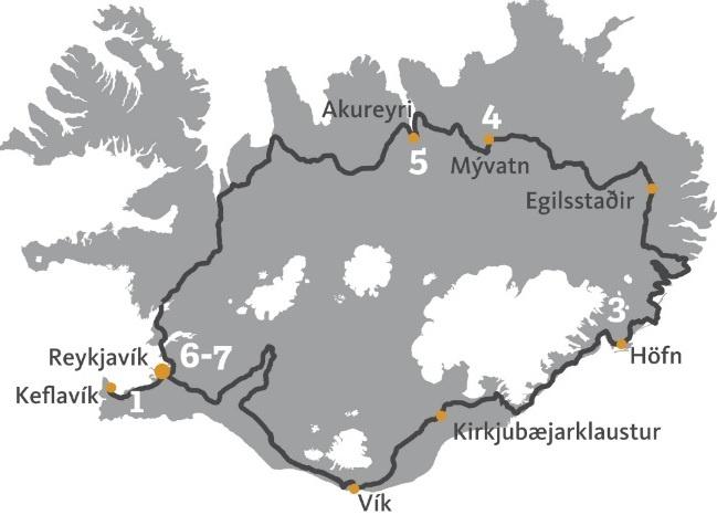 Zonas visitadas: Reykjavík, Círculo Dorado, Parque Nacional Skaftafell, Costa Sur de Islandia, glaciar Vatnajökull, laguna glaciar Jökulsárlón, Mývatn, Akureyri.