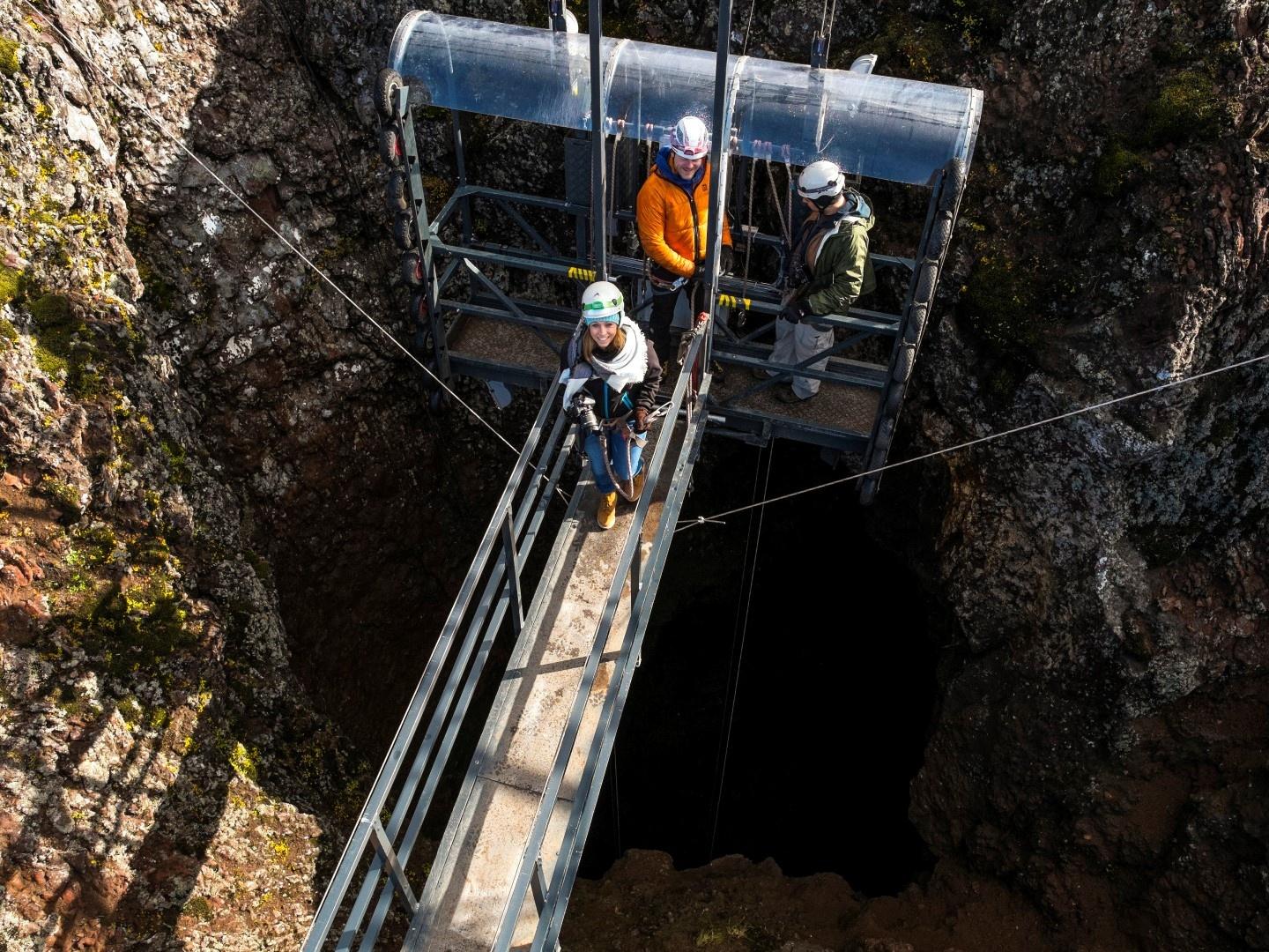 ¿Quieres emprender un viaje a las profundidades de un volcán en Islandia? Si tu respuesta es sí, no esperes más y reserva tu plaza! Las salidas son limitadas. Esta excursión te llevará dentro del volcán Thrihnukagígur, que está inactivo desde hace 4.000 años. Aun así, vivirás una intensa e incomparable aventura, que resulta difícil describir con palabras. La excursión comenzará con la recogida en tu hotel de Reykjavík. El autobús te llevará hasta el comienzo de una caminata entre campos de lava. Esta caminata dura unos 45 minutos. Al llegar, descenderás hasta el fondo del volcán Thrihnukagígur bajando 120 metros, en un ascensor abierto. Las dimensiones del interior del cráter son increíbles y los colores tienen una intensidad realmente fascinante.