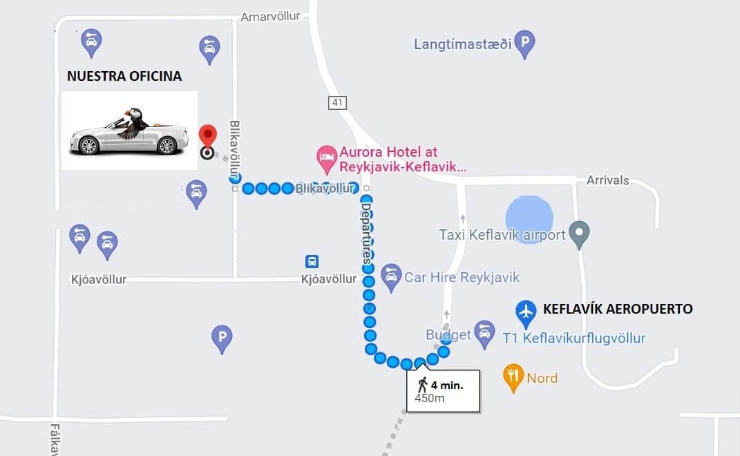 Oficina del aeropuerto: al lado de la terminal. Dirección: Blikavellir 3, 235. Aeropuerto de Keflavík a 4 minutos andando desde la terminal.