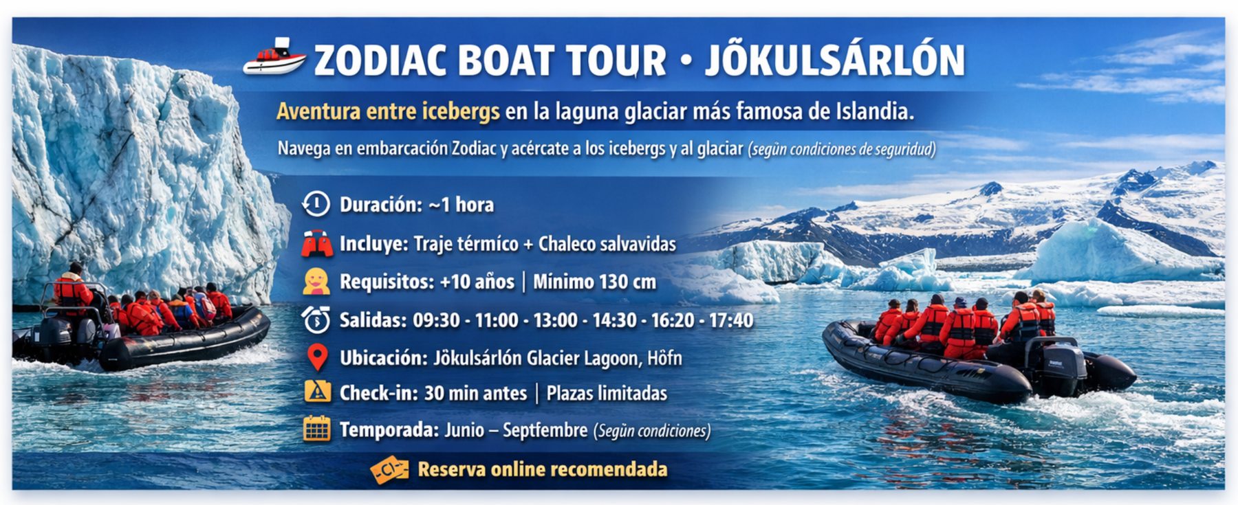 Nota importante: Los tours en la laguna glaciar son realizados bajo la propia responsabilidad de los clientes. ISLANDICA s.r.o. no se responsabiliza de los posibles accidentes que puedan sufrir los participantes durante las actividades o debido a las acciones de estos mismos. Las personas que participen en estas salidas están aceptando estas condiciones al reservar la excursión. El cliente tiene que ser consciente de que toda actividad en la laguna conlleva un riesgo inherente. Código JOK-Z, ID553.